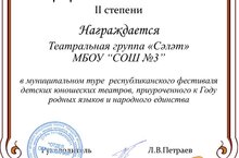 Учащиеся кружка «Сәләт» под руководством учителей татарского языка и литературы Залеевой Г.Г. и Тимиркаевой О.А. приняли участие в муниципальном туре республиканского фестиваля детских юношеских театров, приуроченного к Году родных языков и народного единства и удостоились диплома II степени.