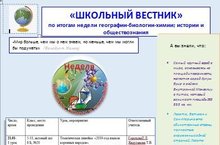 По итогам предметных недель географии,биологии,химии ,истории и обществознания выпущена газета "Школьный вестник." Газета содержит все яркие моменты предметных недель, рубрика интересные факты, исторические моменты.