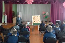 Сегодня состоялась встреча шахматистов четвёртых классов с сильнейшим шахматистов города,района Мукминовым М.Г. Ученики узнали о правилах в дебюте,на шахматной доске Мухамет Галиуллович показал оппозицию. Следующая встреча состоится за шахматной доской.