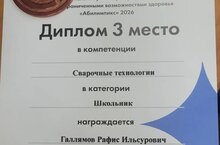 9 апреля в г. Нижнекамске на базе колледжа нефтехимии и нефтепереработки им. Н.В. Лемаева прошел региональный этап Национального чемпионата «Абилимпикс» ученик 9 класса Галлямов Рафис под руководством наставника Салова Н.С. занял почетное 3 место в компетенции «Сварочные технологии», категория - школьник.