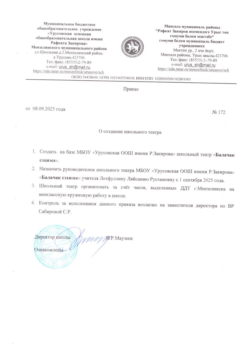 Приказ о создании школьного театра "Балачак сэхнэсе"
