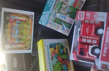Мы приобрели деревянный конструктор, игровой кукольный театр, пожарную машину и набор «Весёлый городок».
