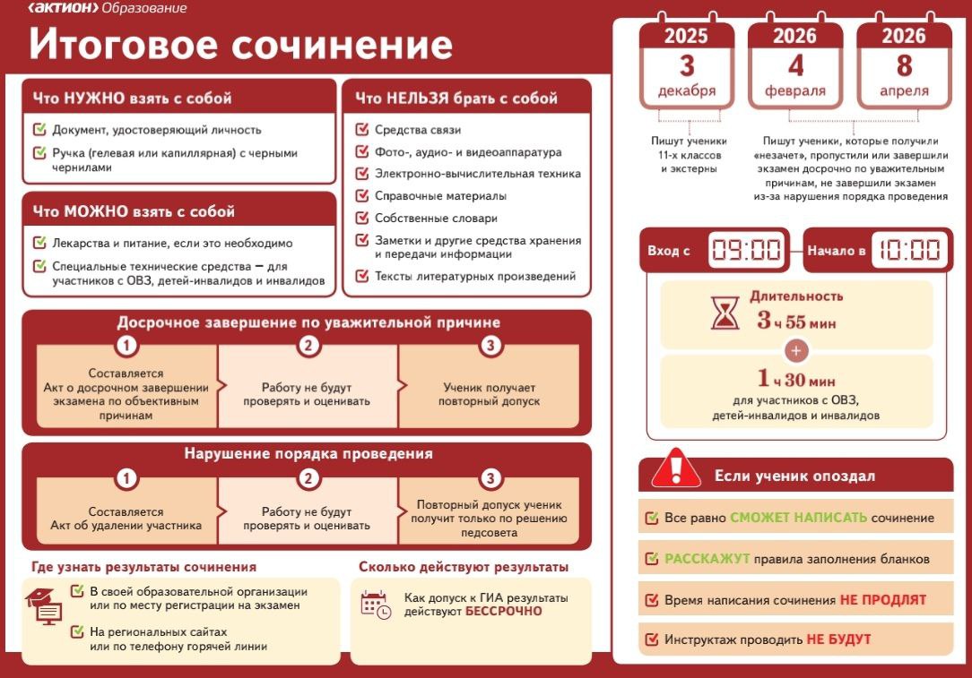 Опубликовано: 27.11.2025????На написание итогового сочинения отводится 3 часа 55 минут. Учащиеся должны раскрыть одну из предложенных тем. Рекомендуемый объём — не менее 350 слов.