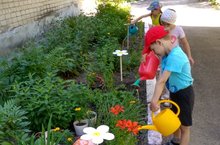 Трудно переоценить значение прогулки в детском саду. На прогулке дети активно двигаются, дышат свежим воздухом, познают окружающий мир, приучаются к труду. Все это полезно для здоровья, физического и умственного развития детей. С большим удовольствием наши воспитанники ухаживают за цветами. В эти жаркие дни цветы нуждаются в обильном поливе.