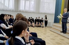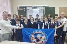 Руководитель Фонда "Zа мирное небо" Тимур Эткеев и Алексей Соловьёв, член выездной команды и отец одного из учеников, провели урок мужества.