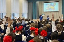 Руководитель Фонда "Zа мирное небо" Тимур Эткеев и Алексей Соловьёв, член выездной команды и отец одного из учеников, провели урок мужества.