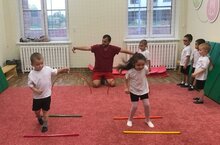 Чтоб успешно развиваться, надо спортом заниматься.Вот мы и бегали, прыгали и играли в веселые игры под руководством нашего инструктора по физической культуре Дениса Сергеевича Ильина