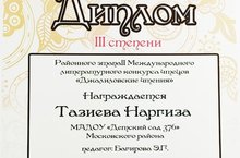 Спешим поделиться радостной новостью - воспитанница 7 группы Наргиза Тазиева стала дипломантом 3 степени районного этапа II Международного литературного конкурса чтецов "Джалиловские чтения" в номинации "М.Джалиль на татарском" возрастная категория 4-8 лет. Желаем Наргизе больших успехов в литературном творчестве! Ждем новых побед!