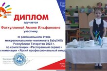 Наш детский сад принял участие в III региональном этапе Межрегионального чемпионата Baby Skills в компетенции "Ресторанный сервис". Поздравляем Фатхуллину Амину и желаем ей будущих успехов