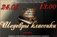 Открываем Новый концертный сезон! "Шедевры классики"! В программе– известные произведения русских, татарских и зарубежных композиторов прозвучат в исполнении фортепиано, скрипки и трубы. Исполнители-лауреаты международных, всероссийских конкурсов, стипендиаты Министерства Культуры РТ, фонда В. Спивакова, Мэра г. Казани, ученики Заслуженного работника культуры Елены Петровны Седмицкой (фортепиано), солиста ГСО РТ Д.Е.Петрова (труба), а также А.Ф. Давлетшина (скрипка).
