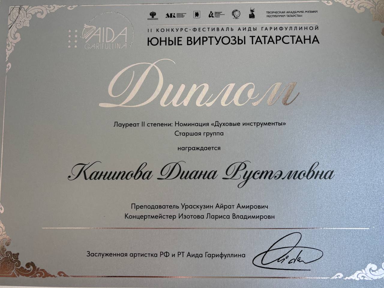 Поздравляем ученицу нашей школы Канипову Диану (класс преподавателя Заслуженного работника культуры РТ - Ураскузина Айрата Амировича, концертмейстер - Изотова Лариса Владимировна) с победой на II конкурсе - фестивале Аиды Гарифуллиной "Юные виртуозы Татарстана"! Желаем дальнейших творческих успехов и новых побед!