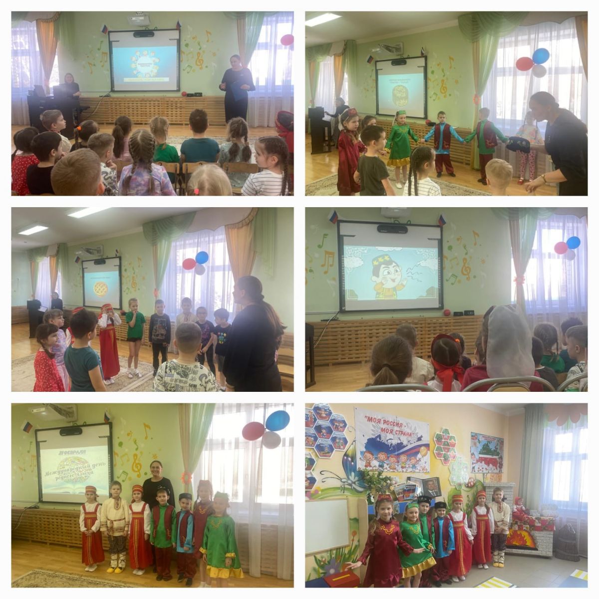 В Международный День родного языка в нашем детском саду прошло музыкально-литературное мероприятие «Общаемся на языке дружбы», направленное на расширение представлений старших дошкольников о родном языке, языковых и культурных традициях, о значении родного языка в жизни каждого человека. С большим интересом дети старших и подготовительных групп участвовали в познавательной викторине, конкурсе знатоков пословиц и поговорок, сочиняли и отгадывали загадки, играли в русские и татарские народные игры, просмотрели мультфильм "Смешарики", серия, посвящённая Татарстану-"Азбука дружбы народов". Мероприятие имело большое воспитательное и развивающее значение, способствовало формированию духовной основы дошкольников, познавательной и творческой активности детей.