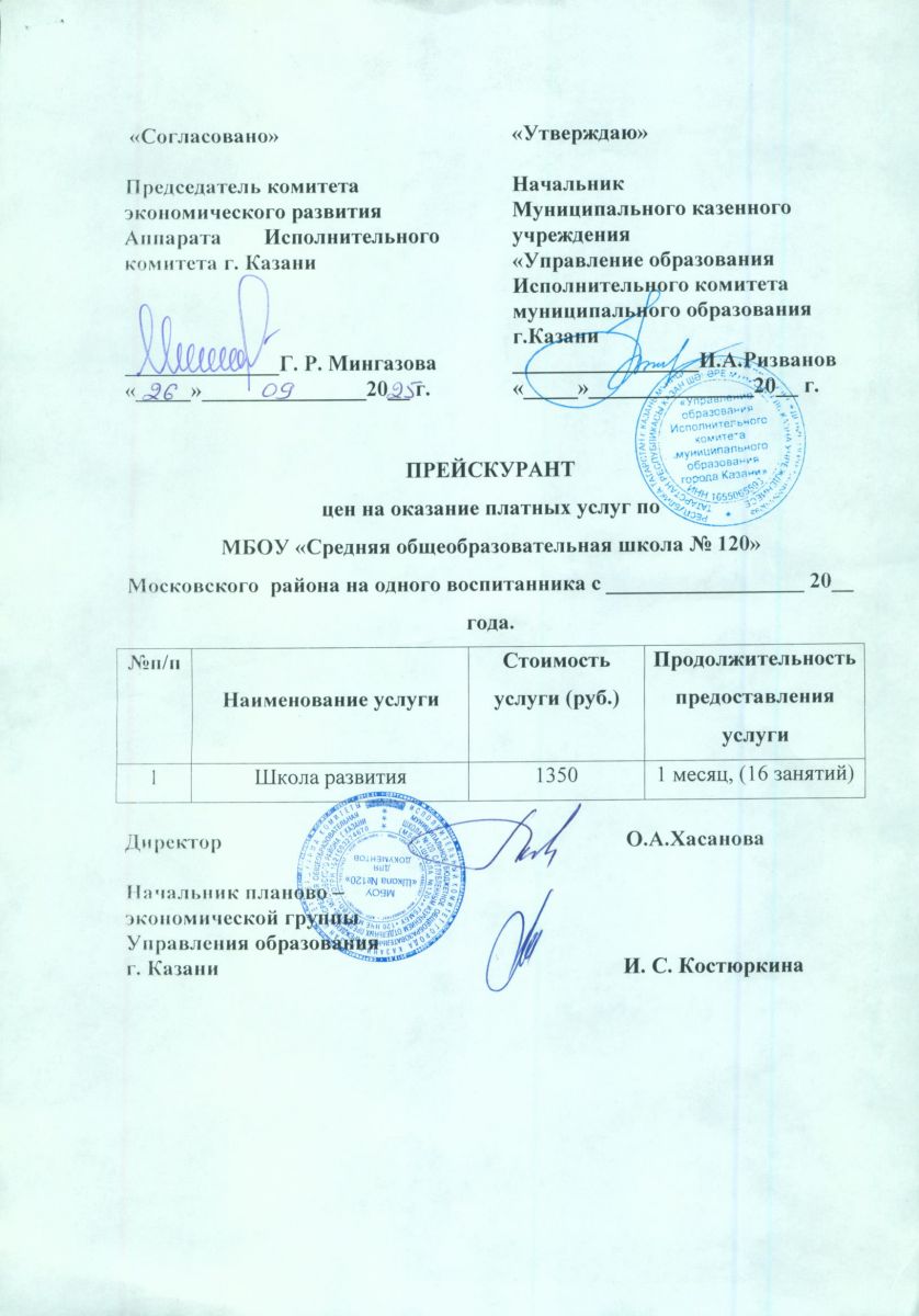 ПРЕЙСКУРАНТ цен на оказание платных услуг с октября 2020 года