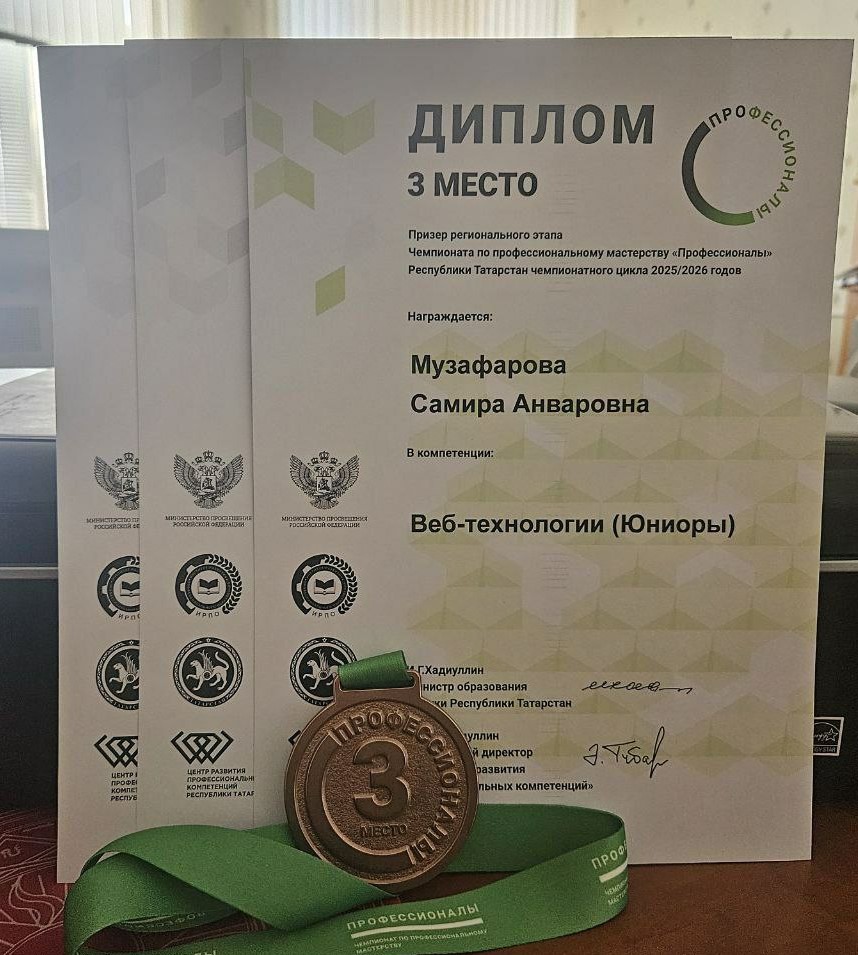 Поздравляем Музафарову Самиру (педагог Меркутова И.И.) с блестящим достижением — третьим местом в напряжённой борьбе на региональном этапе чемпионата профессионального мастерства "Профессионалы" Республики Татарстан в сезоне 2025/2026 годов! Это победа показывает твой талант , упорство и преданность своему делу! Мы гордимся тобой и желаем дальнейших успехов и побед!