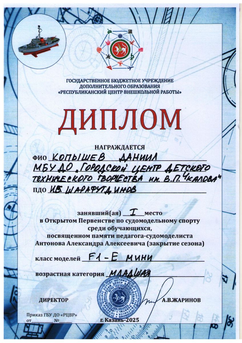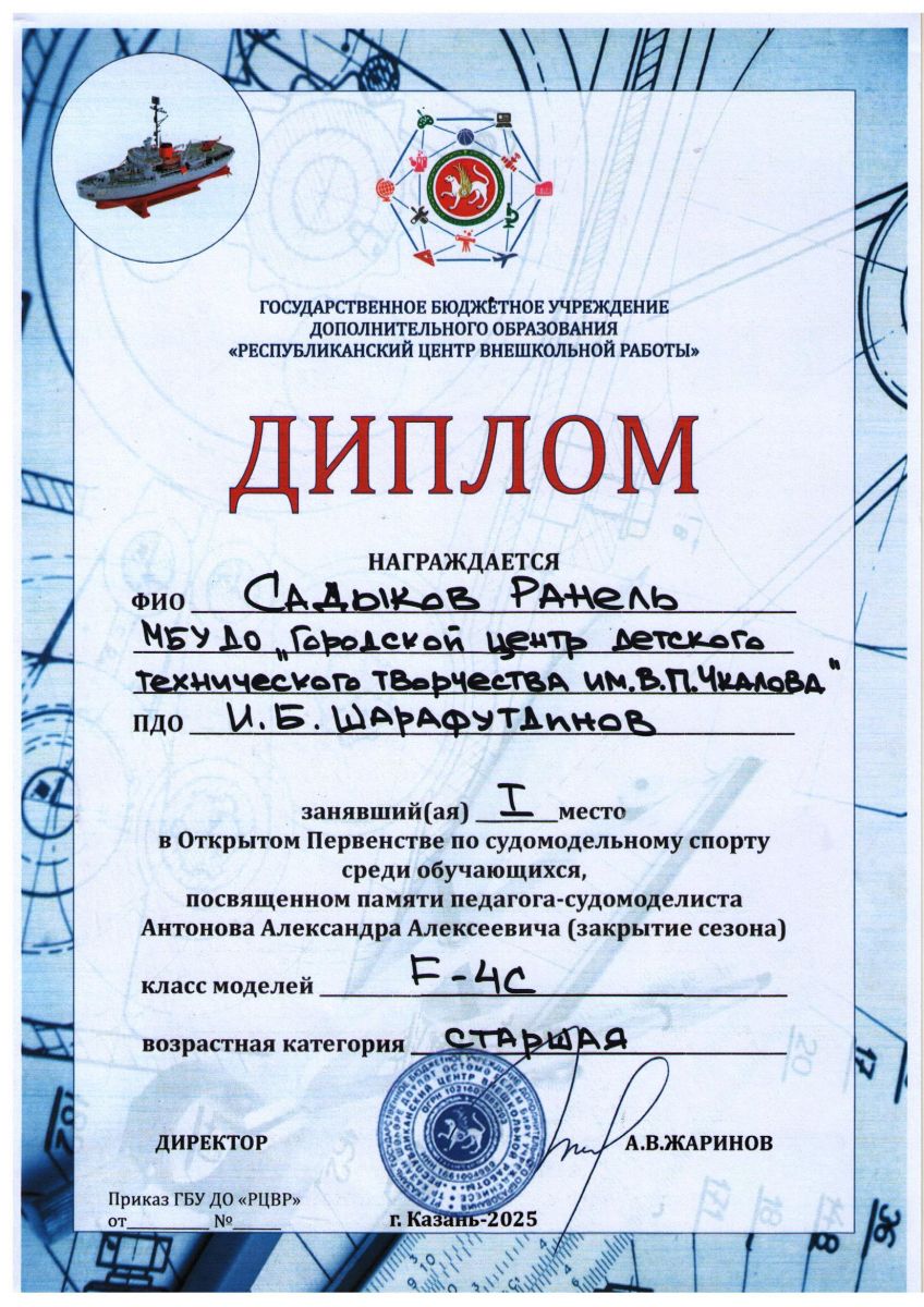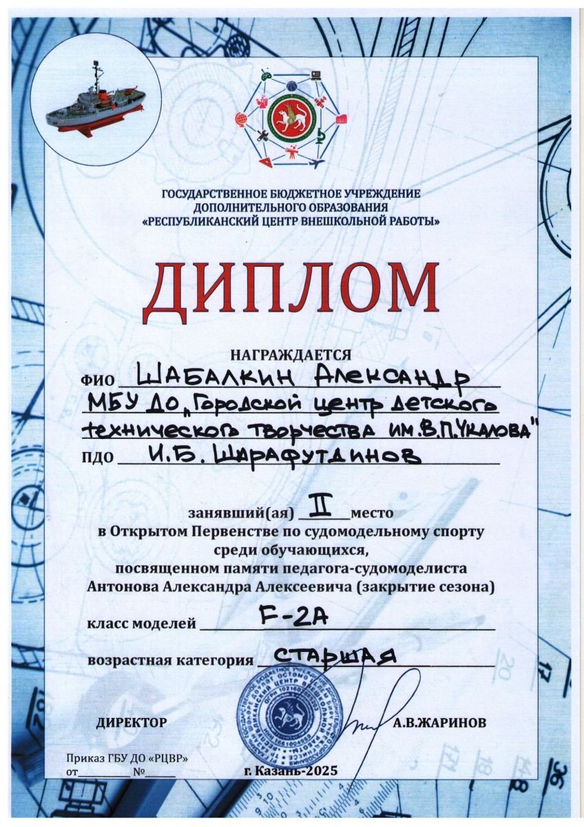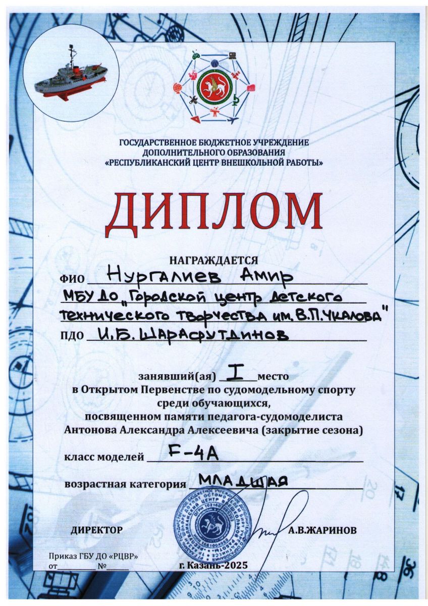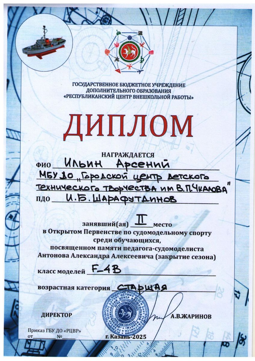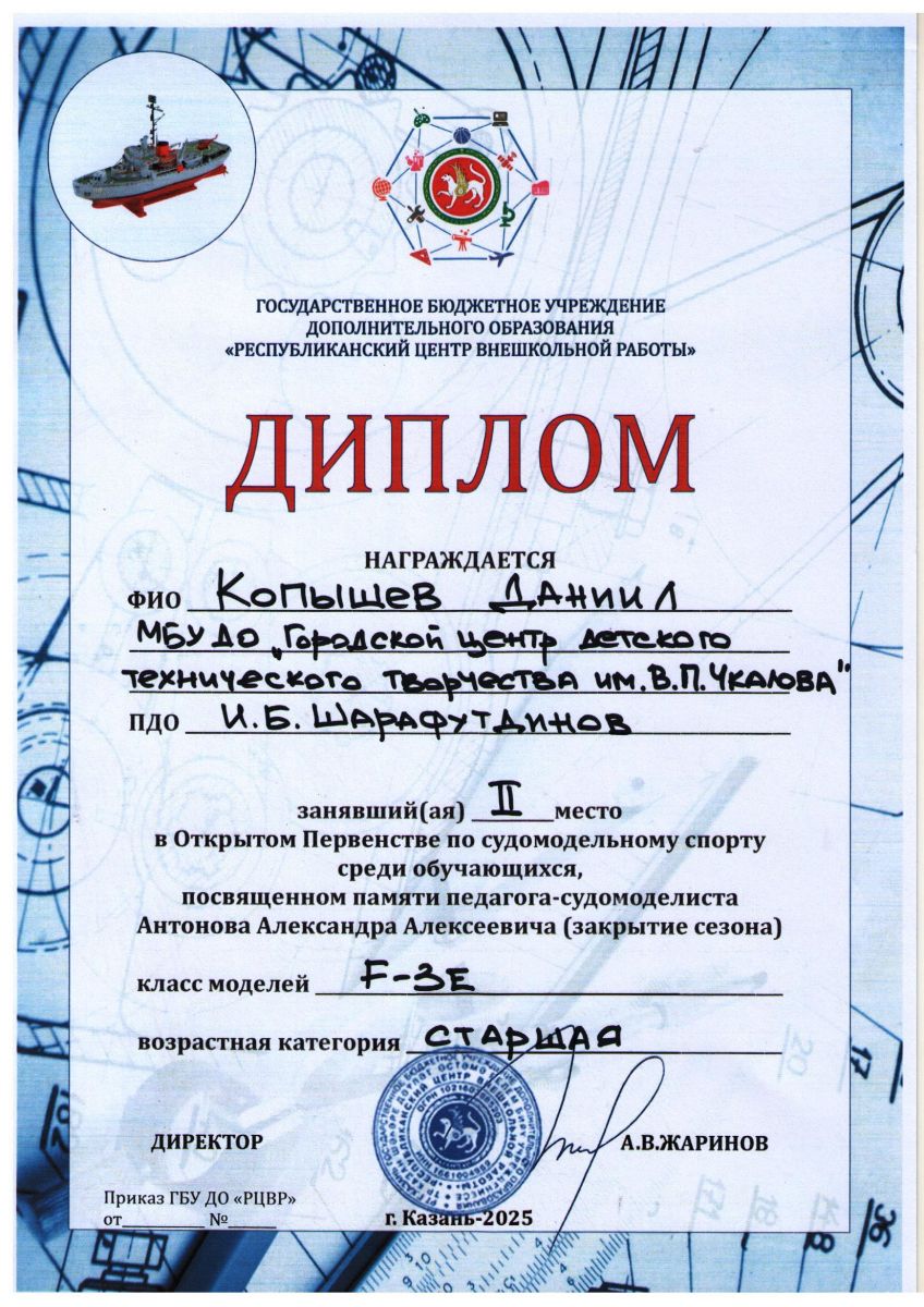 Опубликовано: 13.09.2025Поздравляем обучающихся педагога Шарафутдинова И.Б. с призовыми местами в Открытом первенстве по судомодельному спорту среди обучающихся, посвященном памяти педагога-судомоделиста Антонова А.А. (закрытие сезона)!