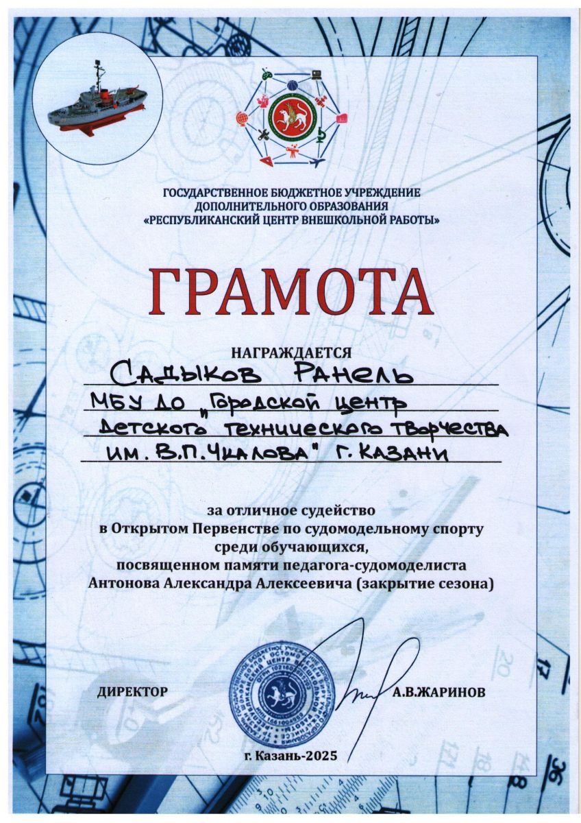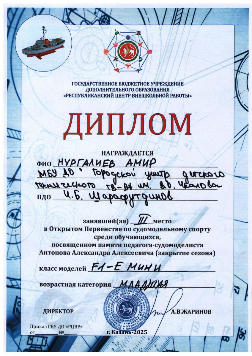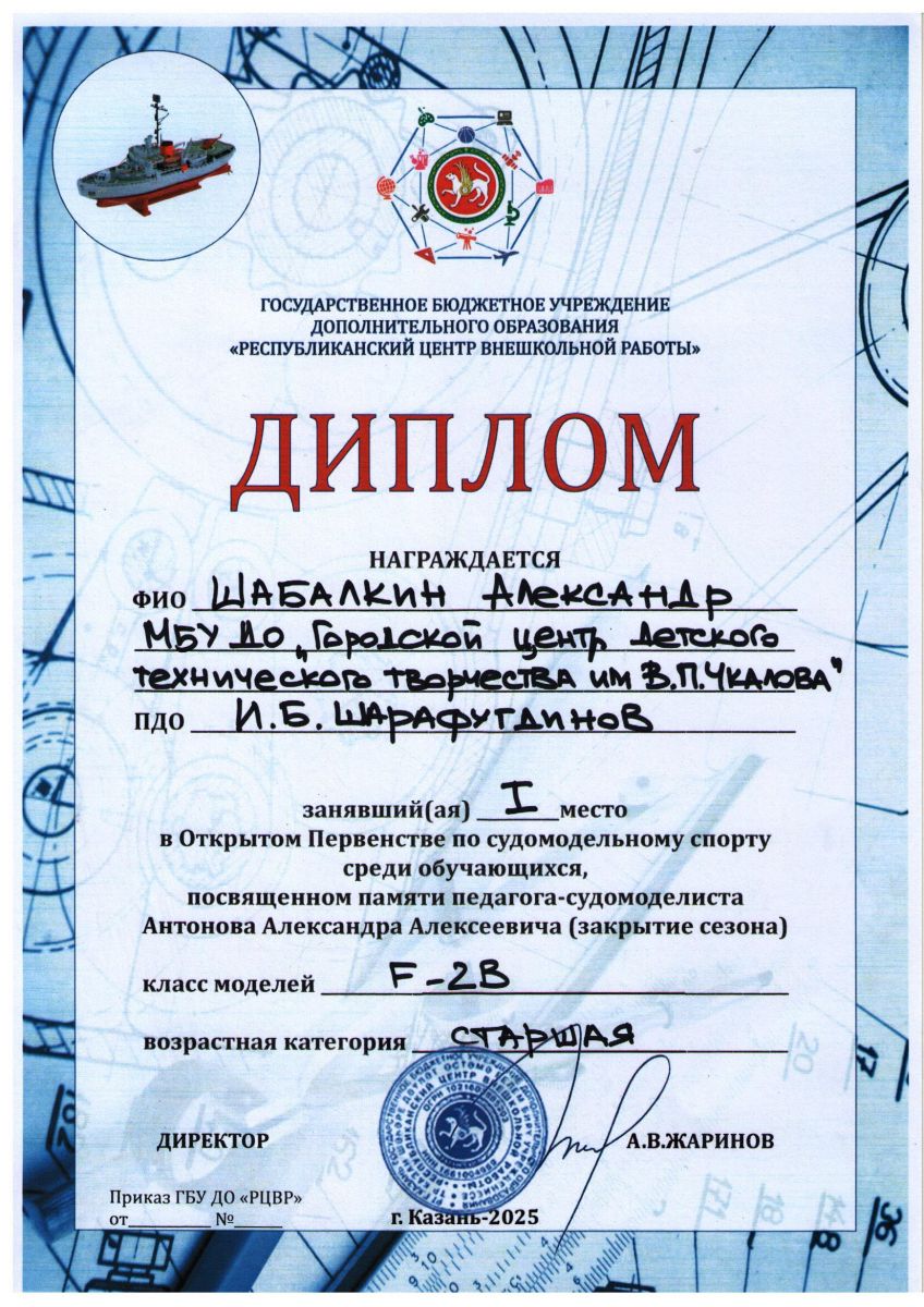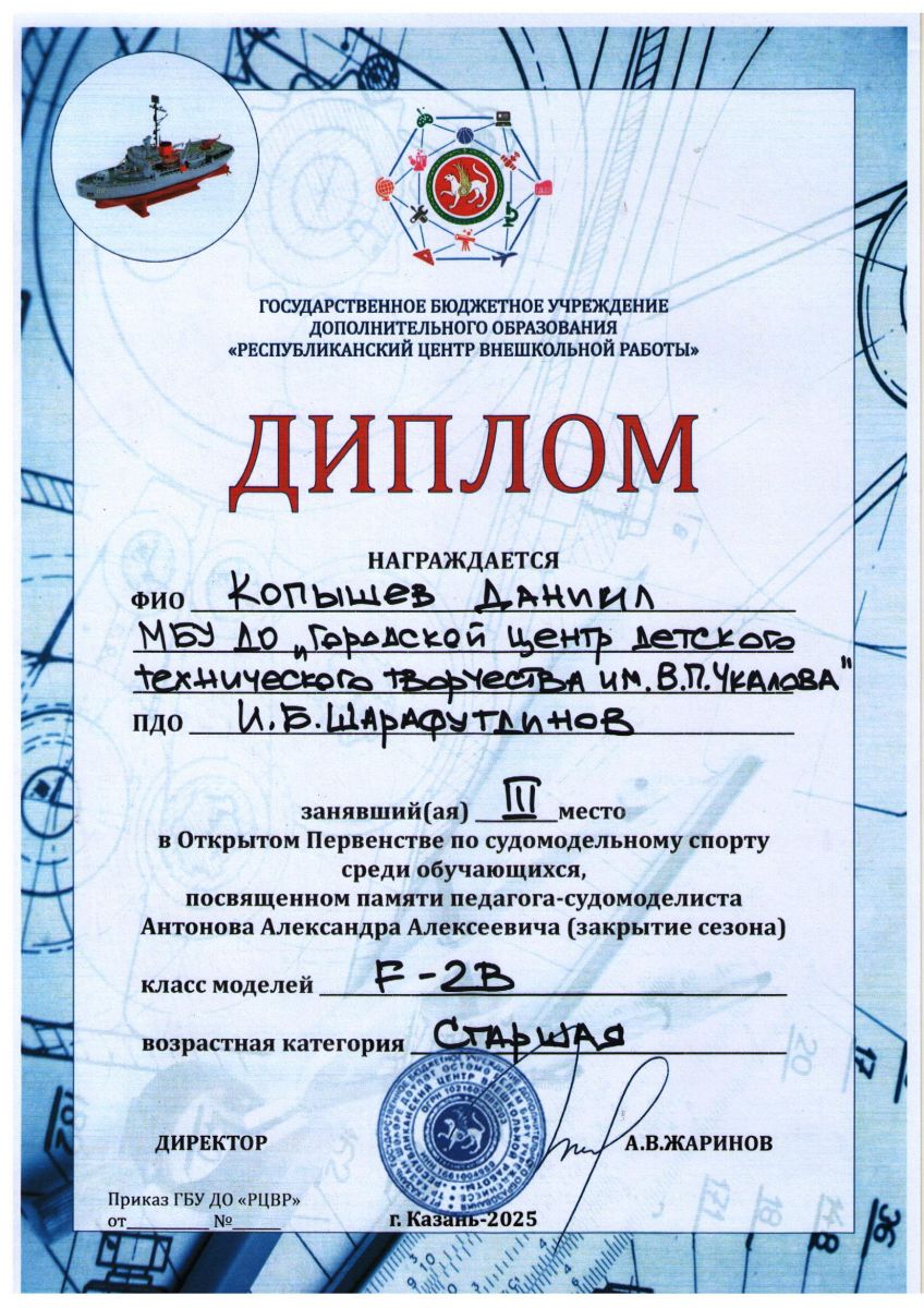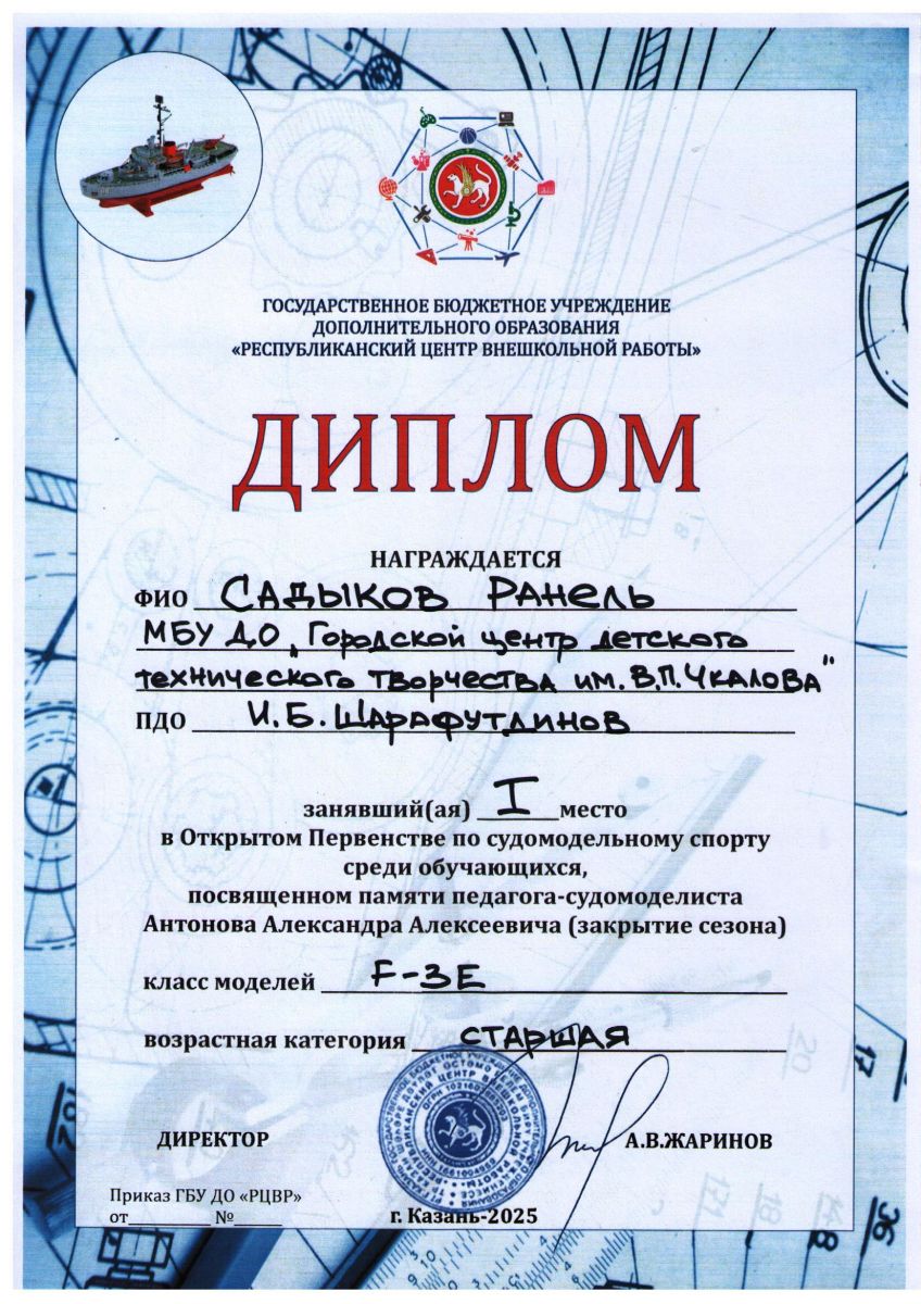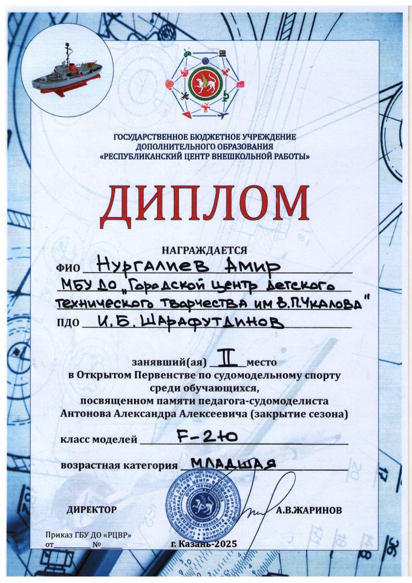 Опубликовано: 13.09.2025Поздравляем обучающихся педагога Шарафутдинова И.Б. с призовыми местами в Открытом первенстве по судомодельному спорту среди обучающихся, посвященном памяти педагога-судомоделиста Антонова А.А. (закрытие сезона)!