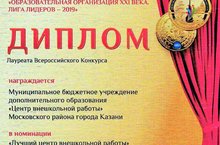 Поздравляем! Центр внешкольной работы стал лауреатом Всероссийского конкурса "Образовательная организация XXI века.Лига лидеров - 2019". Директору Богомоловой Рамзие Мунавировне присвоен знак "Эффективный руководитель - 2019"! Желаем дальнейших успехов в деле воспитания детей и молодежи!