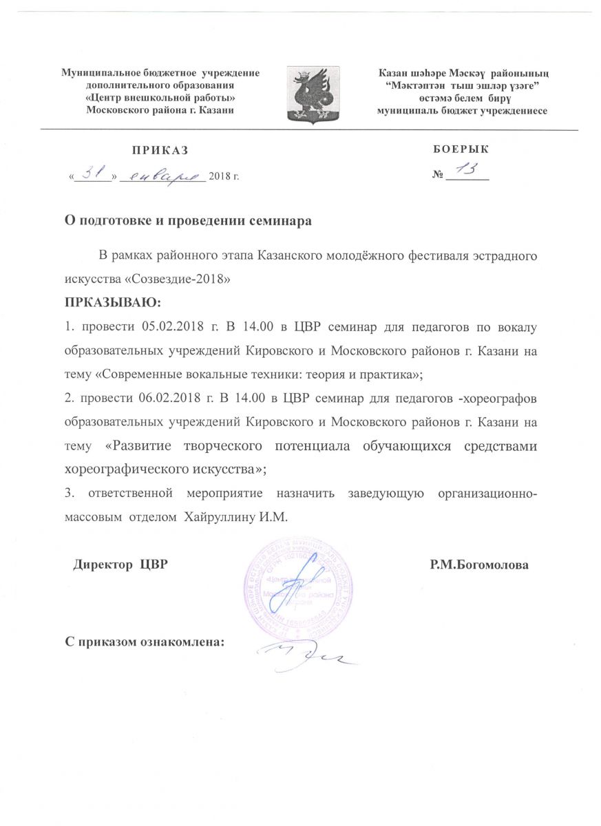 Семинар для педагогов-хореографов образовательных учреждений Кировского и Московского районов в рамках проведения районного этапа Казанского молодежного фестиваля "Созвездие-2018" Приказ/upload/storage/org5322/files/13 созвездие.jpg Программа/upload/storage/org5322/files/6 февр Созвездие.pdf
