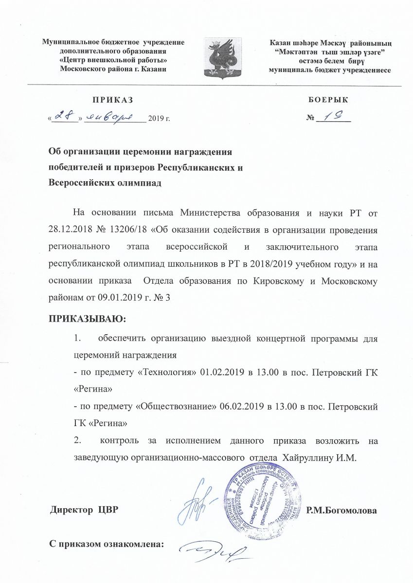 9. Организация и проведение закрытия Республиканской олимпиады школьников по технологии 01.02.19 Приказ