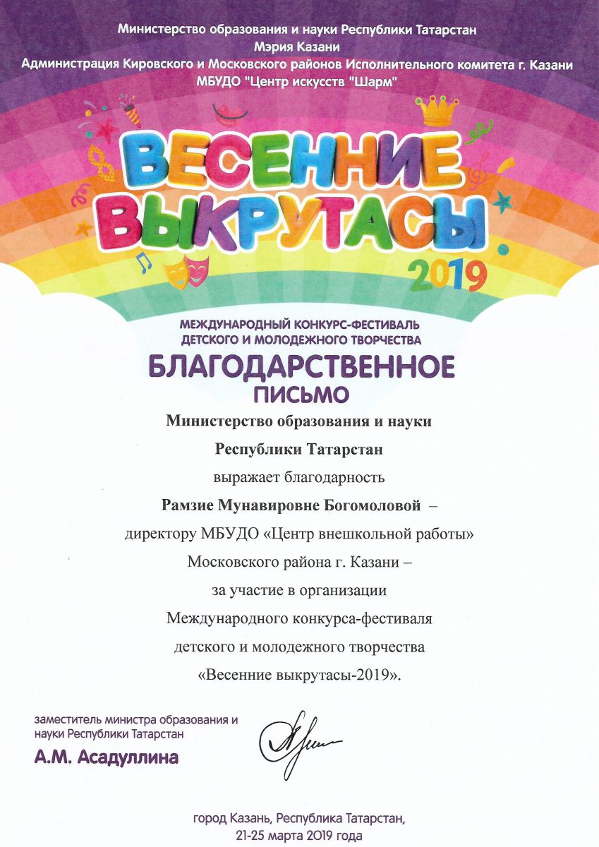 1. Международный конкурс-фестиваль детского и молодежного творчества «Весенние выкрутасы-2019» Благодарственное письмо Богомоловой Р.М. за участие в организации. Письмо