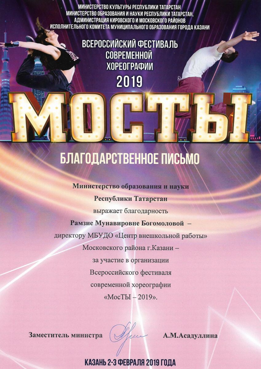 5. Благодарственное письмо Богомоловой Р.М. за участие в организации Всероссийского фестиваля современной хореографии «МосТЫ-2019» Письмо
