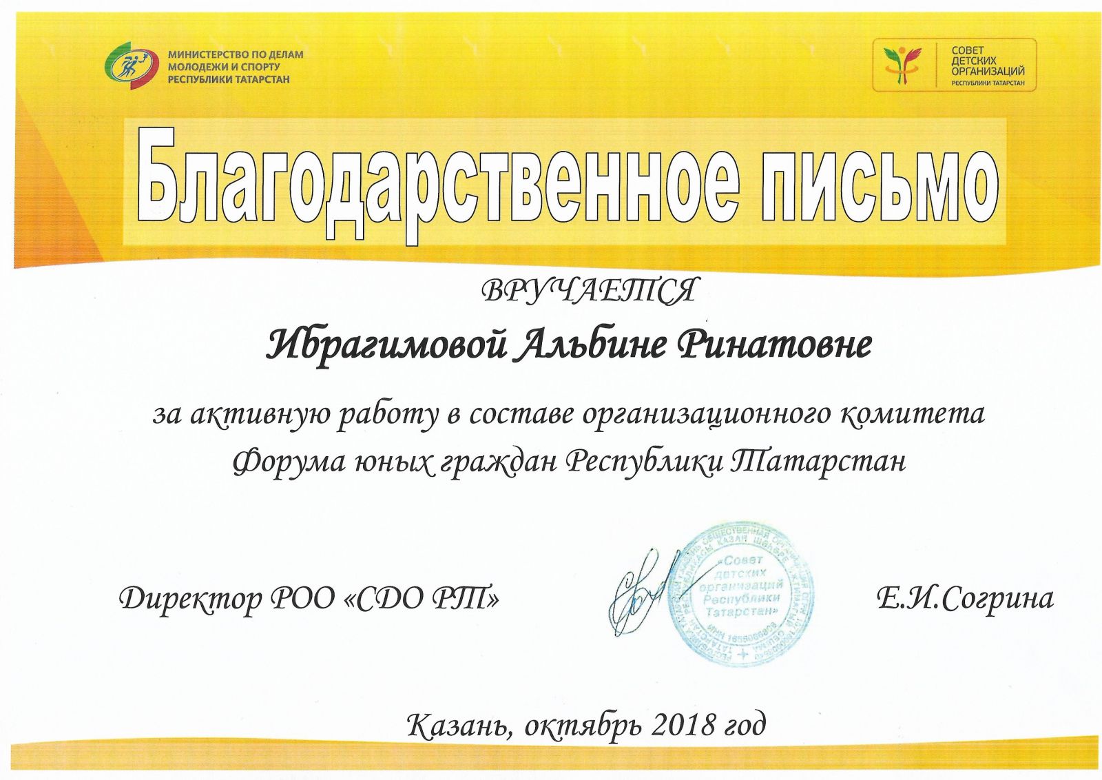 2. VII Форум юных граждан Письмо РОО «СДО РТ» Приказ Благодарственное письмо Ибрагимовой А.Р. за работу в составе оргкомитета