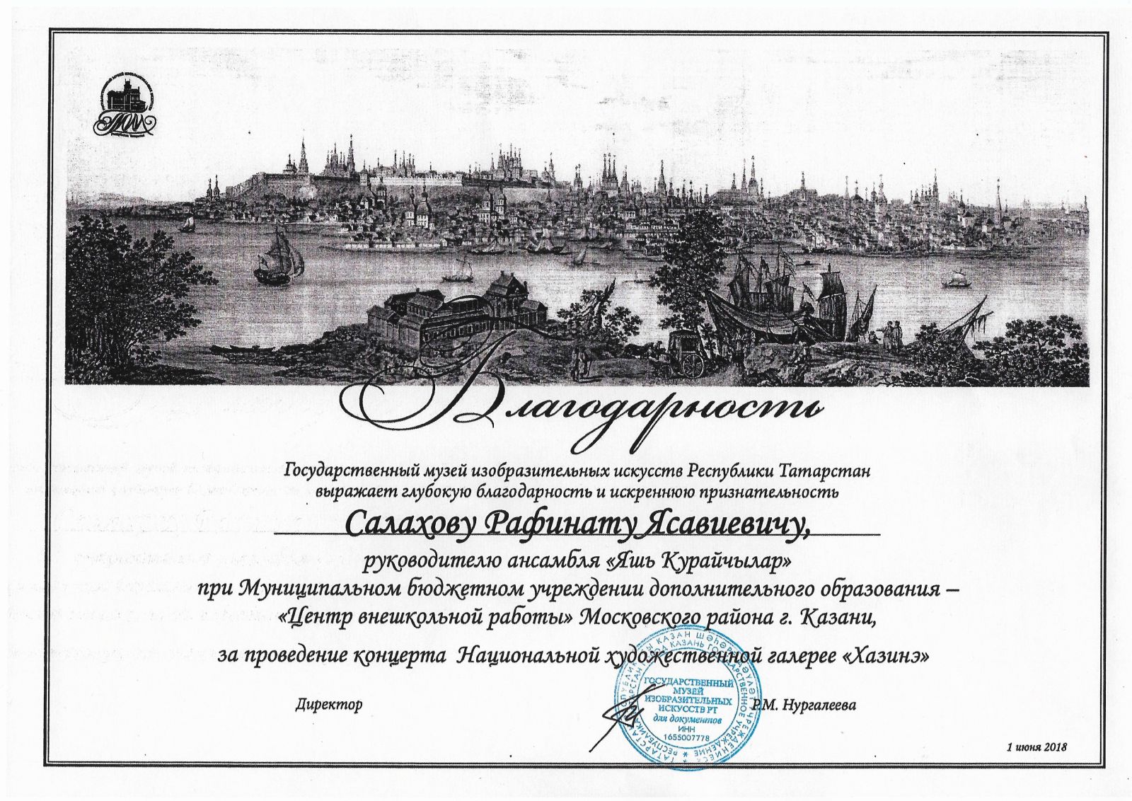 3. Благодарность Салахову Р.Я. за проведение концерта в Национальной художественной галерее «Хазинэ»