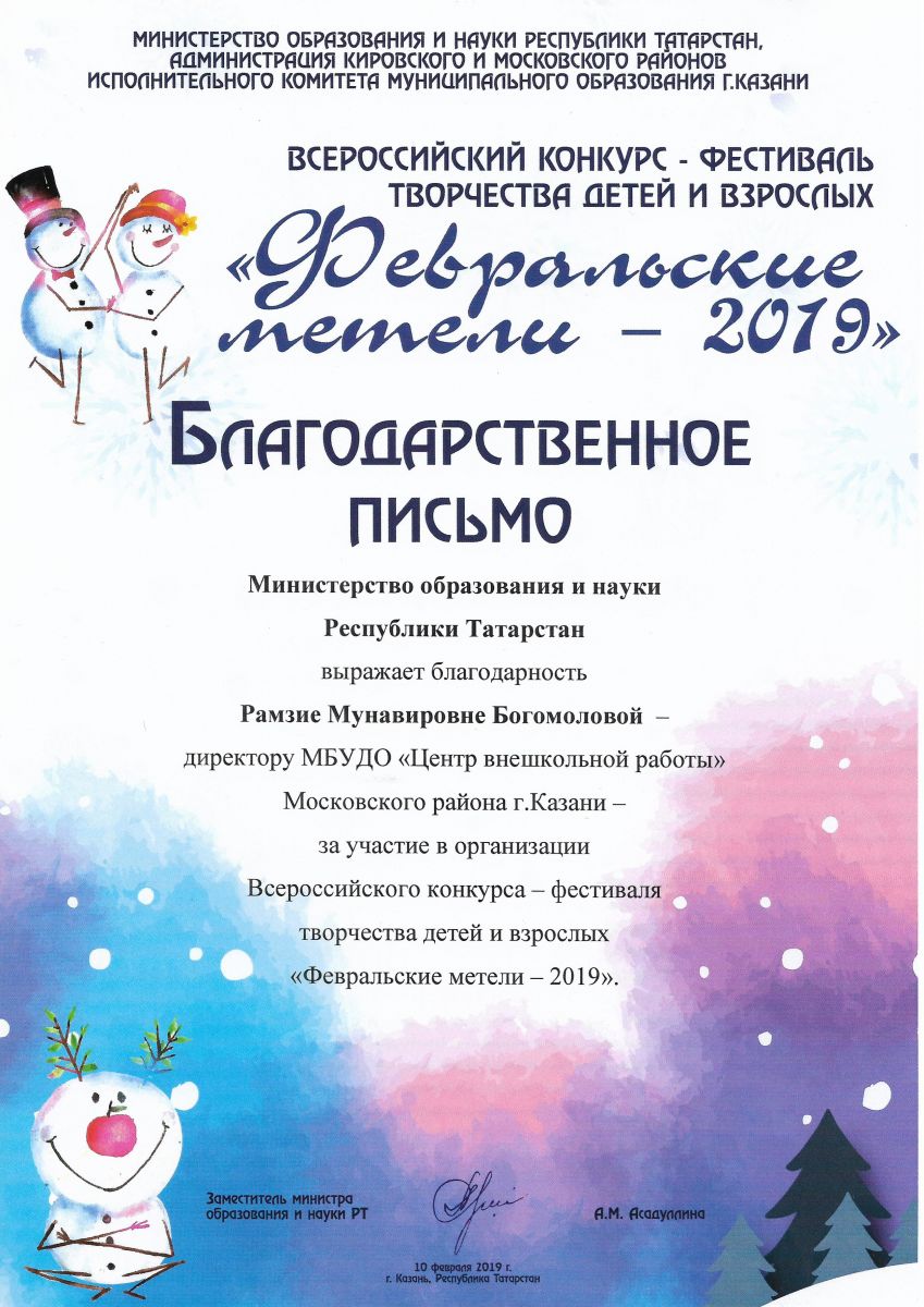 4. Благодарственное письмо Богомоловой Р.М. за участие в организации Всероссийского конкурса-фестиваля творчества детей и взрослых «Февральские метели – 2019» Письмо