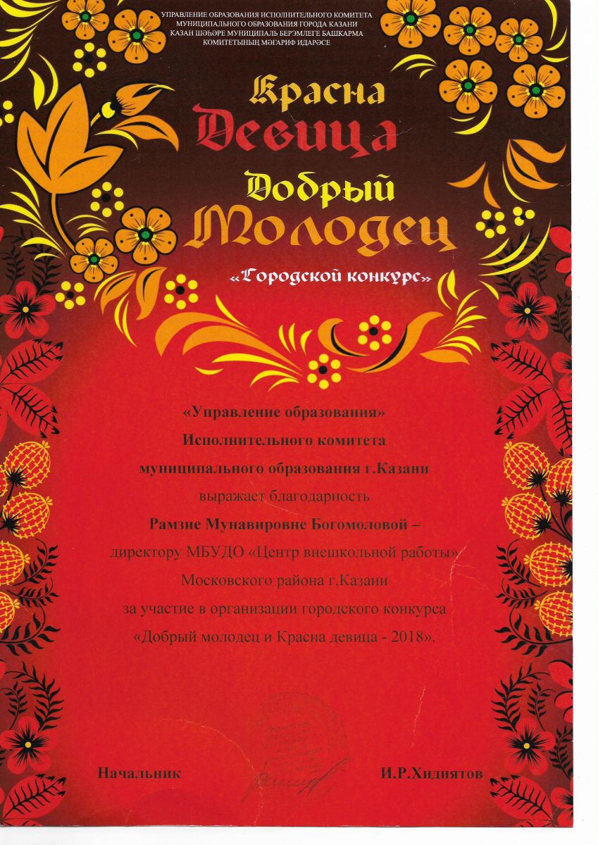 - Учстие в организации проведении городского конкурса "Доброый молодец, Красна девица" Благодарность