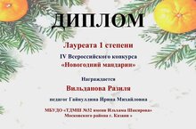 Поздравляем нашу талантливую ученицу Вильданову Разилю с блестящей победой на IV Всероссийском конкурсе «Новогодний мандарин» – она стала Лауреатом I степени!Отдельная благодарность преподавателю И.М. Гайнуллиной за профессионализм, мастерство и подготовку лауреата.Желаем новых и ярких побед!