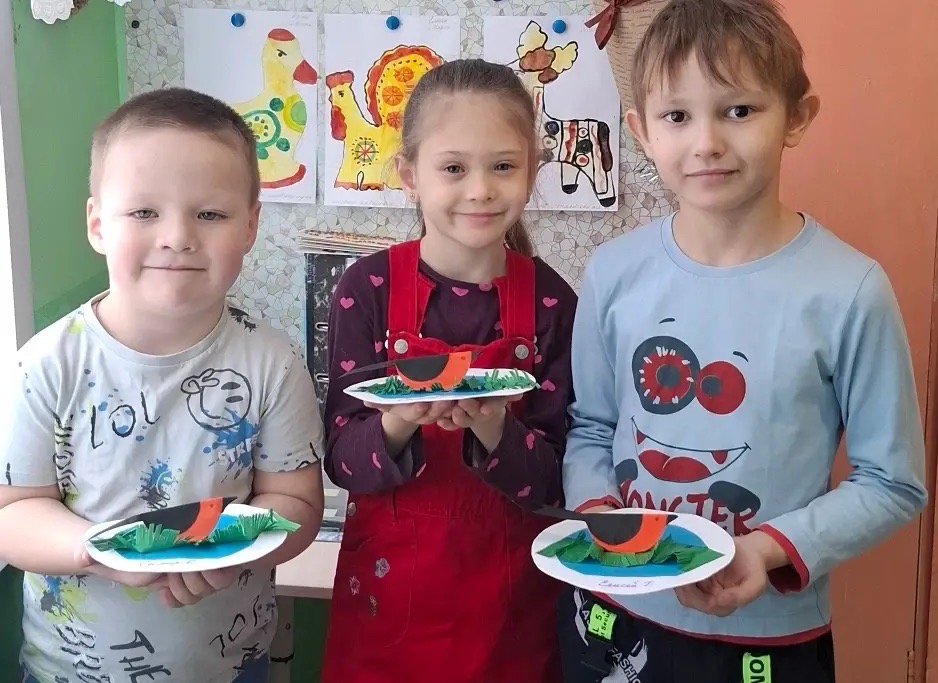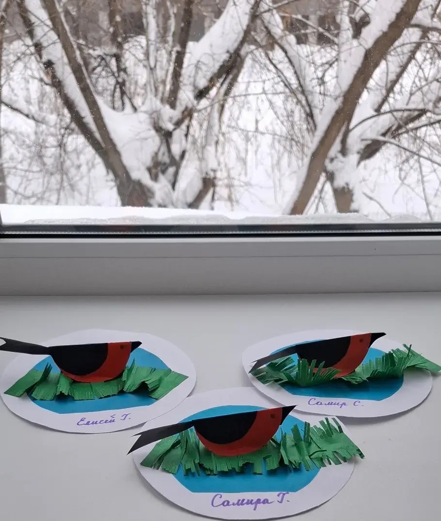 Воспитатель группы №6 (ЗПР) кратко рассказала о том, как выглядят снегири, где они любят сидеть зимой и какие у них яркие грудки — и дети сразу загорелись идеей: сделать своих птиц тёплыми и пушистыми.На занятии дети познакомились со снегирями и изготовили аппликации, выражая заботу о пернатых через творчество. Упражнялись в аккуратности, ответственности и командной работе. Итог — яркий стенд и желание наблюдать за птицами ЗиМой.