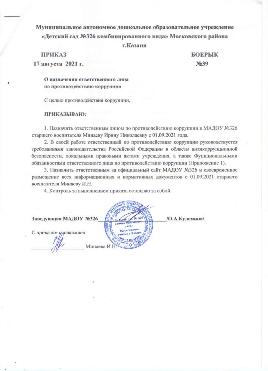 Приказ о назначении ответственного лица по противодействию коррупции от 2022 года