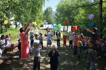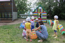 Праздник проходил на улице, на участке детского сада. Дети умело переносили яйца в ложках и воду в ведрах. Самым сложным для ребят, оказалось, попасть по горшку с закрытыми глазами.