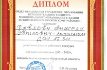 В районном этапе городского конкурса "Лучший воспитатель дошкольного образовательного учреждения - 2015" наш детский сад представляет воспитатель первой квалификационной категории Павлова Анжела Эвриковна.