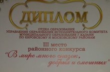 Поздравляем Хусаинову Н.А. логопеда подготовительной группы №5, которая приняла участие в районном конкурсе "В мире много сказок, добрых и смешных" и была награждена дипломом за III место. Желаем дальнейших успехов и новых побед!