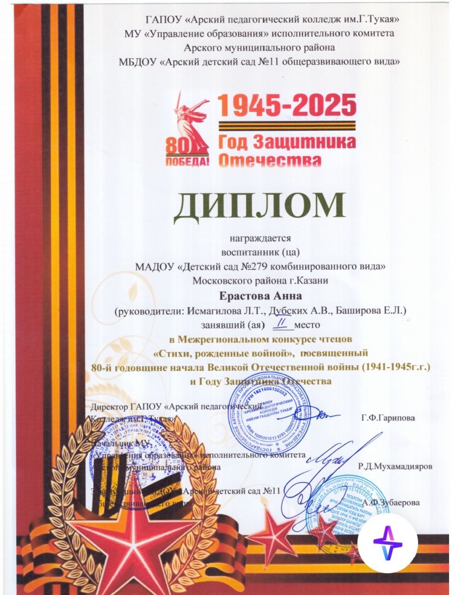 Опубликовано: 05.05.2025Воспитанница 9 логопедической подготовительной к школе группы участвовала в межрегиональном конкурсе чтецов "Стихи, рожденные войной", посвященный 80-й годовщине ВОВ и Году Защитника Отечества. Гордимся II место.