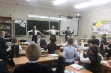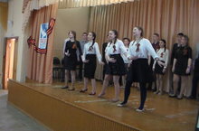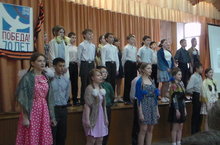 В этот же день в актовом зале школы на конкурсе патриотической песни свою интересную инсценировку представили наши выпускники, ученики 11А класса, которые получили единогласную оценку жюри как самого поющего класса в школьном конкурсе.