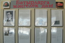 В год 70-летия Великой Победы в нашей школе была развёрнута выставка под общим названием «Героям вечная слава». На стенде расположена информация о боевом пути известных татарских писателей М. Джалиля и Ф. Карима, с оружием в руках, защищавших своё Отечество и геройски погибших за Родину!
