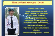 В эти дни в городе Казани проходит конкурс «Добрый молодец и Красна девица – 2014», основная цель которого воспитание в подрастающем поколении ценностного отношения к культурно-историческому наследию России, пропаганда нравственных ценностей и здорового образа жизни. Наша школа не осталась в стороне от этого события. Честь школы в этом городском состязании ума, интеллекта, смекалки и сноровки будет отстаивать ученик 10 класса А, Пожелаем нашему доброму молодцу удачи в предстоящих испытаниях!