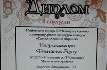 Поздравляем ученицу 11А кл Фаизову Алсу, занявшую 1 место в районом этапе III Международного литературного конкурса чтецов "Джалиловские чтения"! Молодец! Так держать!