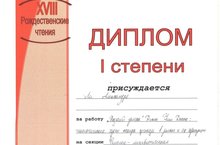 Поздравляем Ли Александру, ученицу 11А класса, занявшую 1 место в Республиканской научно-практической конференции "Рождественские чтения", которая состоялась 24 января 2020 года в гимназии 75 Московского района. Благодарим за подготовку участницы её научного руководителя Сухую О.А., кандидата педагогических наук, учителя русского языка и литературы высшей квалификационной категории.