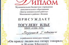 Поздравляем Тогулева Илью, учащегося 10а класса с победой в районном конкурса чтецов «Он правду людям под гитару говорил»