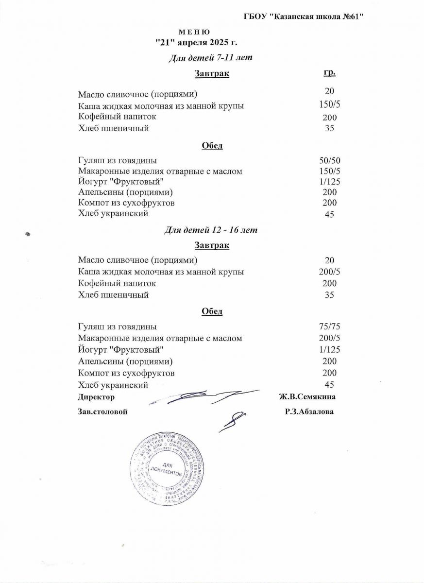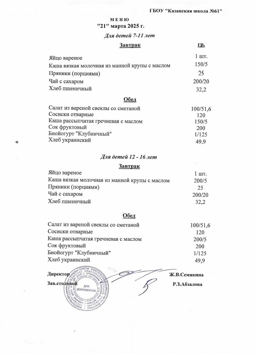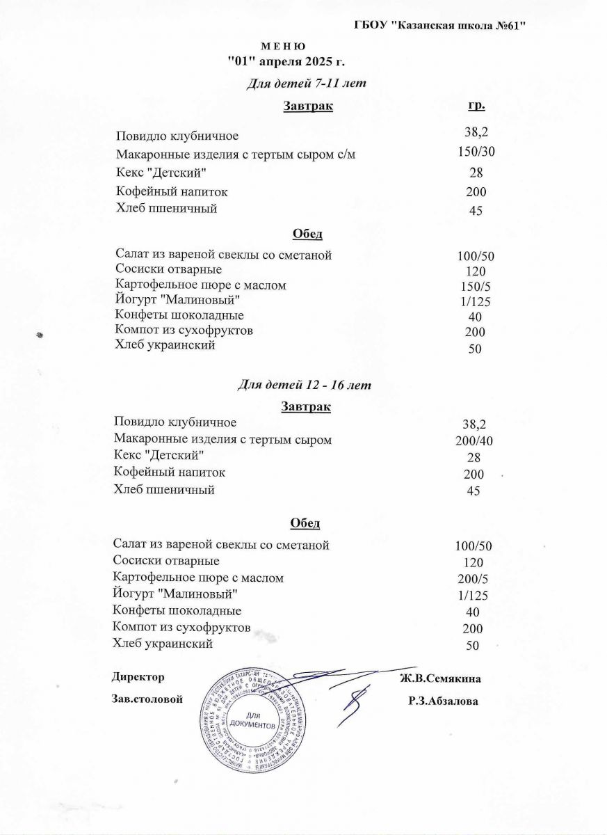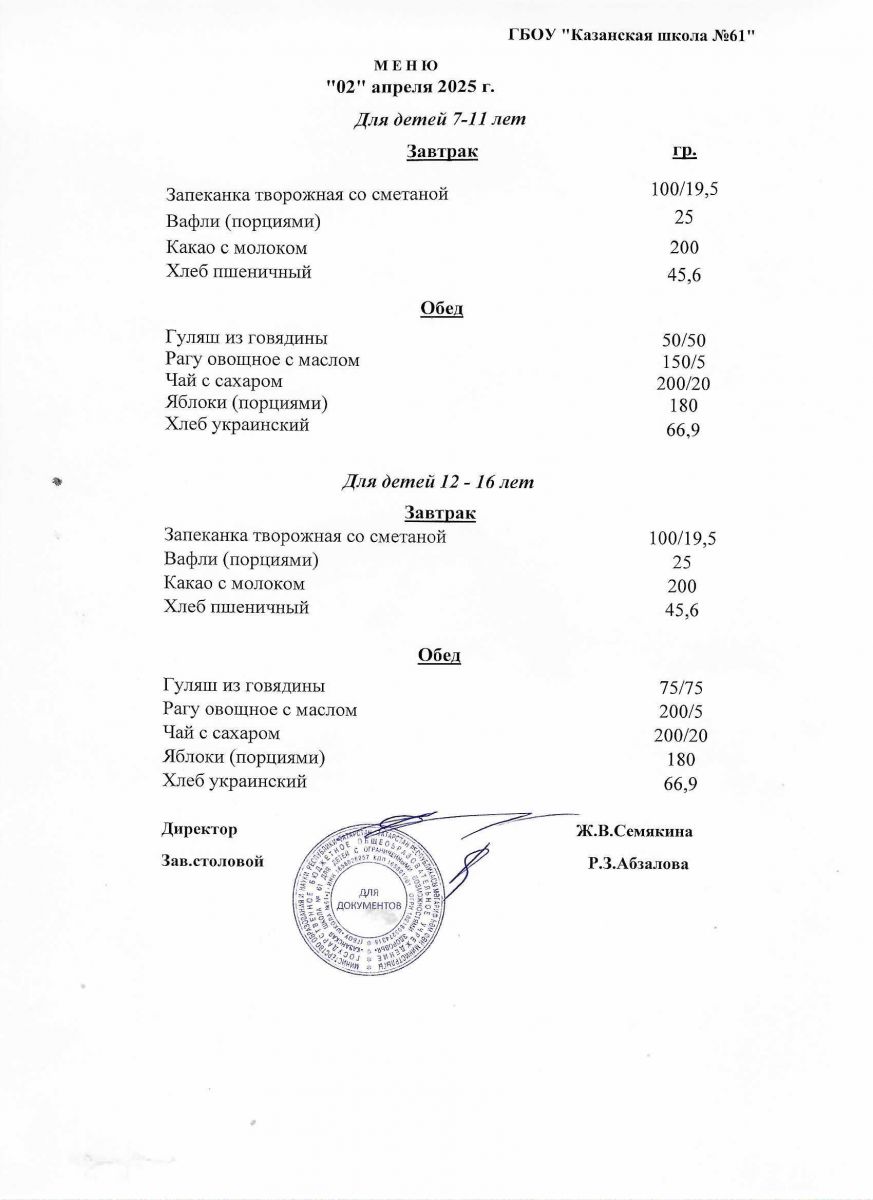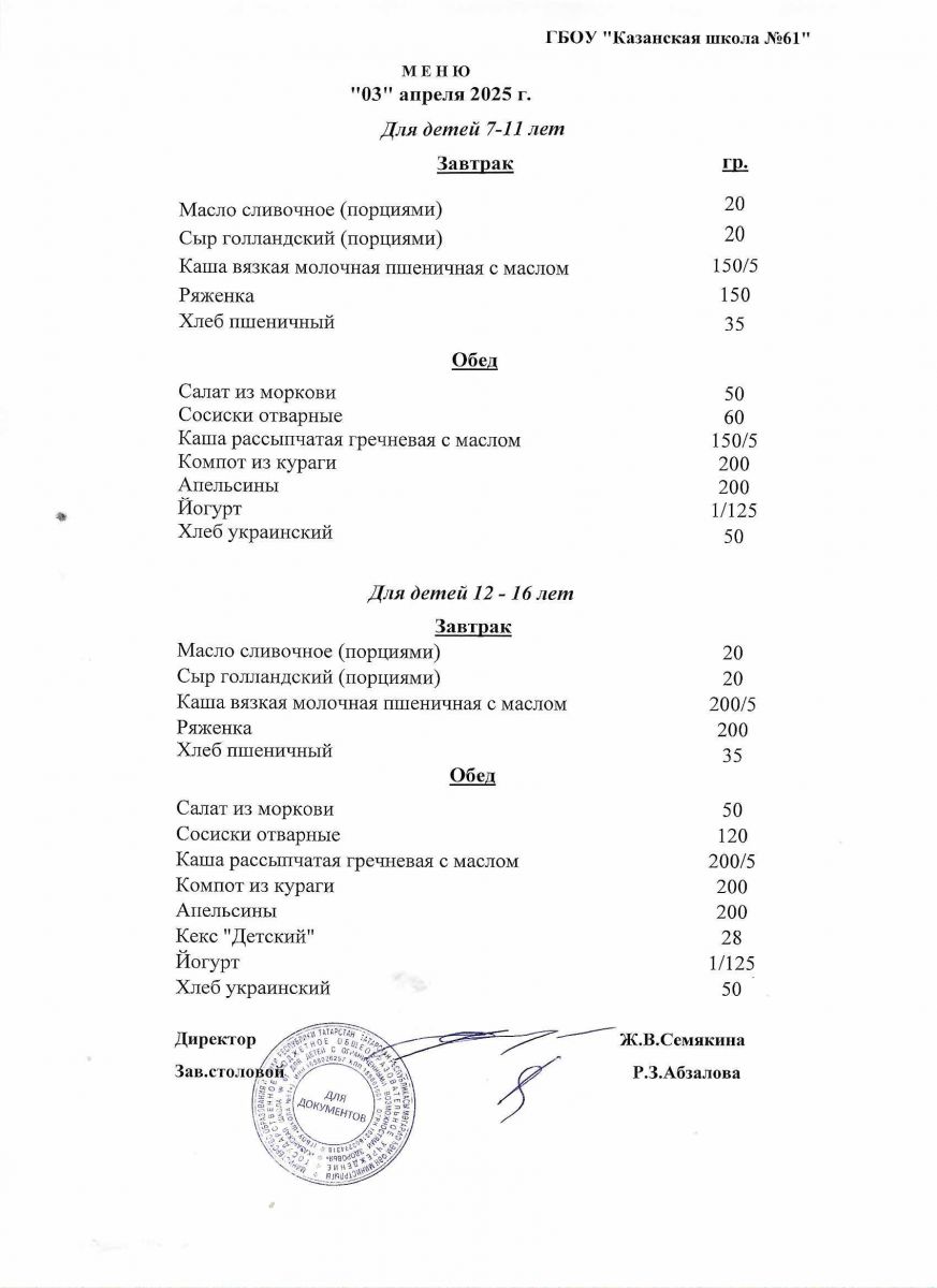 Меню на период с 31 марта по 2 апреля 2021 г.