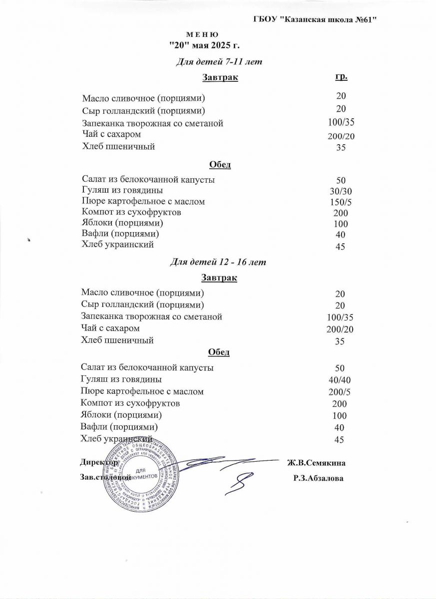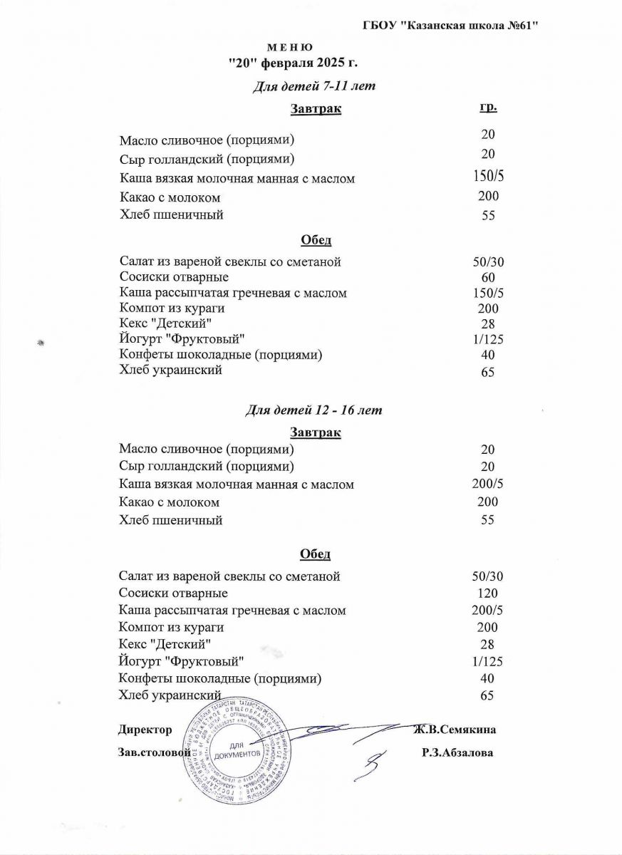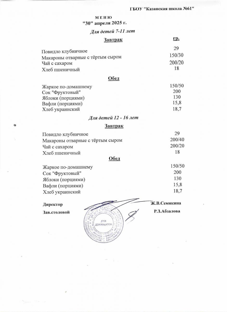 Меню на период с 30 ноября по 4 декабря  2020 г.
