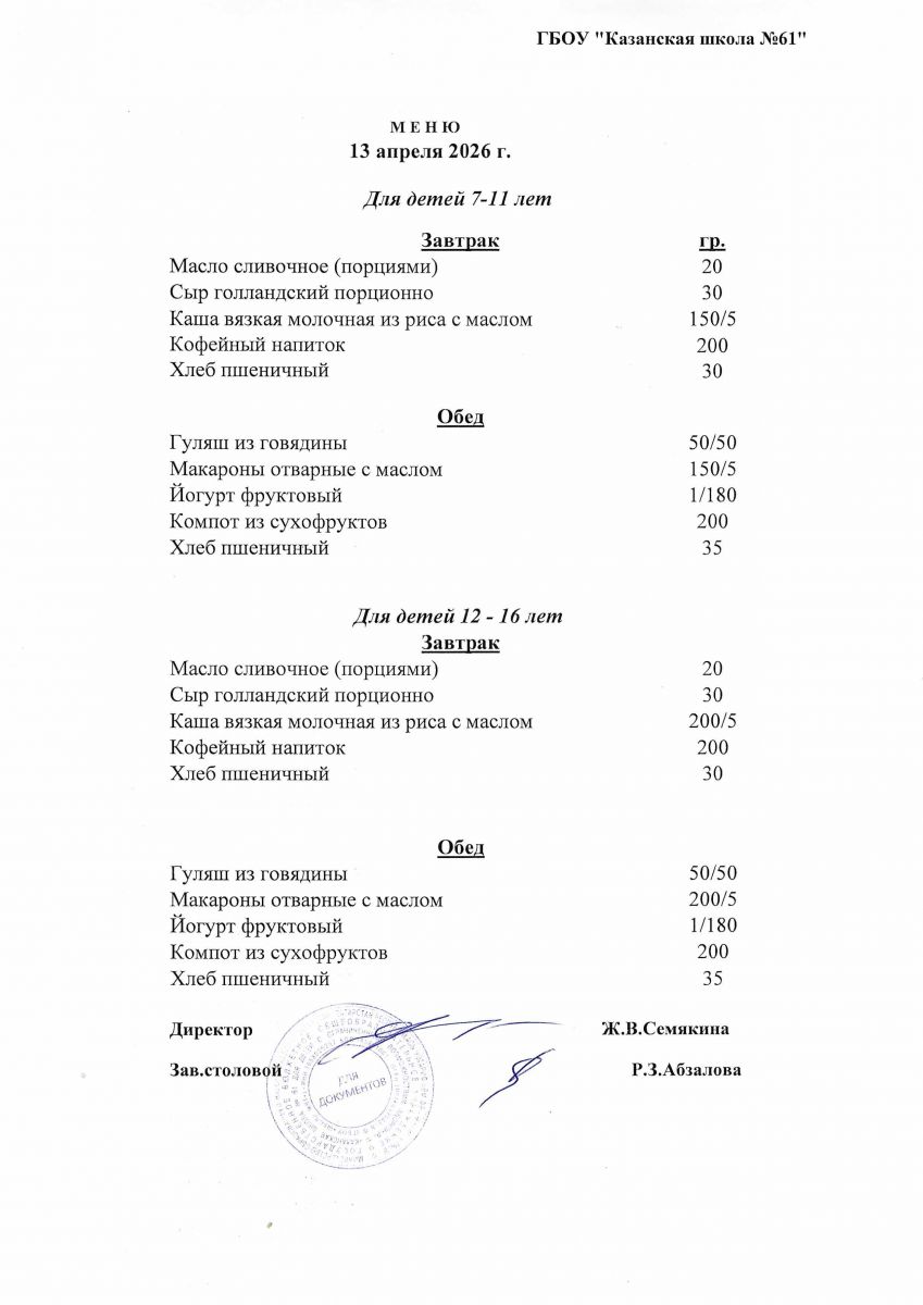 Меню на 13.04.2026
