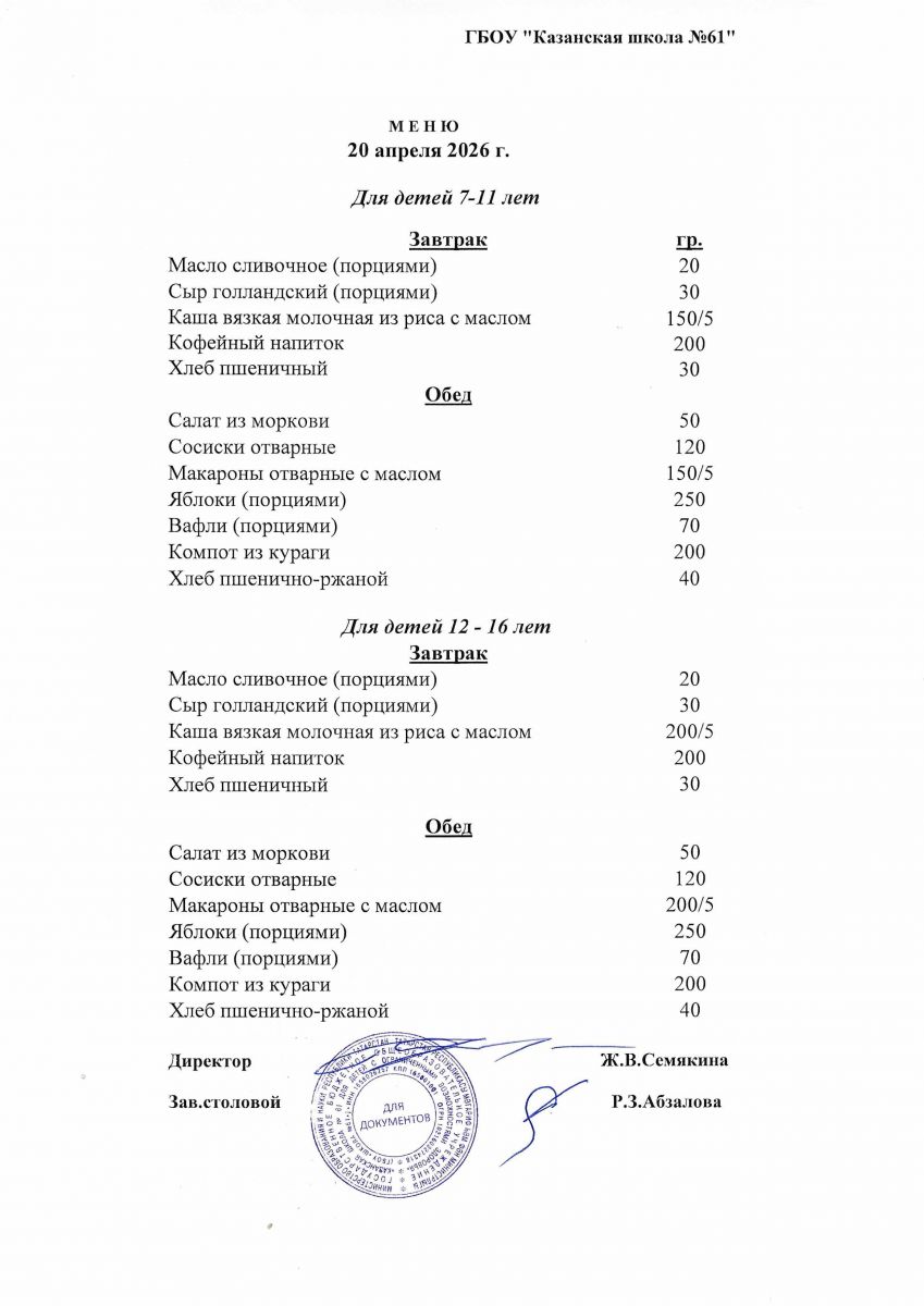 Меню на 20.04.2026