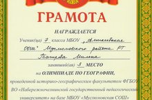 Укучыларыбыз Яр Чаллы дәүләт педагогия университетының тарих-география факультеты базасында географиядән үткәрелгән региональ олимпиадада катнашты. Якупов И. һәм Шайхразиева А. катнашучы сертификатына ия булды, ә Тагирова М. 3 урынны яулады. (укытучылары Мубараков И.М. ) Аларны котлыйбыз һәм киләчәктә уңышлар телибез!
