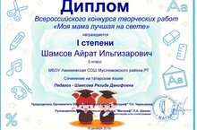 “Мәгариф” белем бирү үзәге үткәргән Бөтенроссия “Минем әни дөньяда иң яхшысы” иҗади эшләр конкурсында 5-8 нче сыйныф укучылары арасында Шамс А. җиңүче булды.