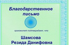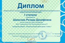 “Мәгариф” белем бирү үзәге үткәргән Бөтенроссия турыдан –туры белем бирүэшчәнлеге”Педагогик инициатива” конспектлар конкурсында татар теле һәм әдәбияты укытучысы Шамсова Резида Дәниф кызының 7 нче сыйныфка татар теле дәресенә төзелгән технологик картасы җиңүче булып бәяләнде.