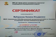 Ученица 3 класса Мубаракова Лилияна участвовала В Республиканском конкурсе любительских короткометражных фильмов детского движения "Маленькое кино большой Республики" и награждена сертификатом за активное участие. Руководитель Хамматуллина Р.М.
